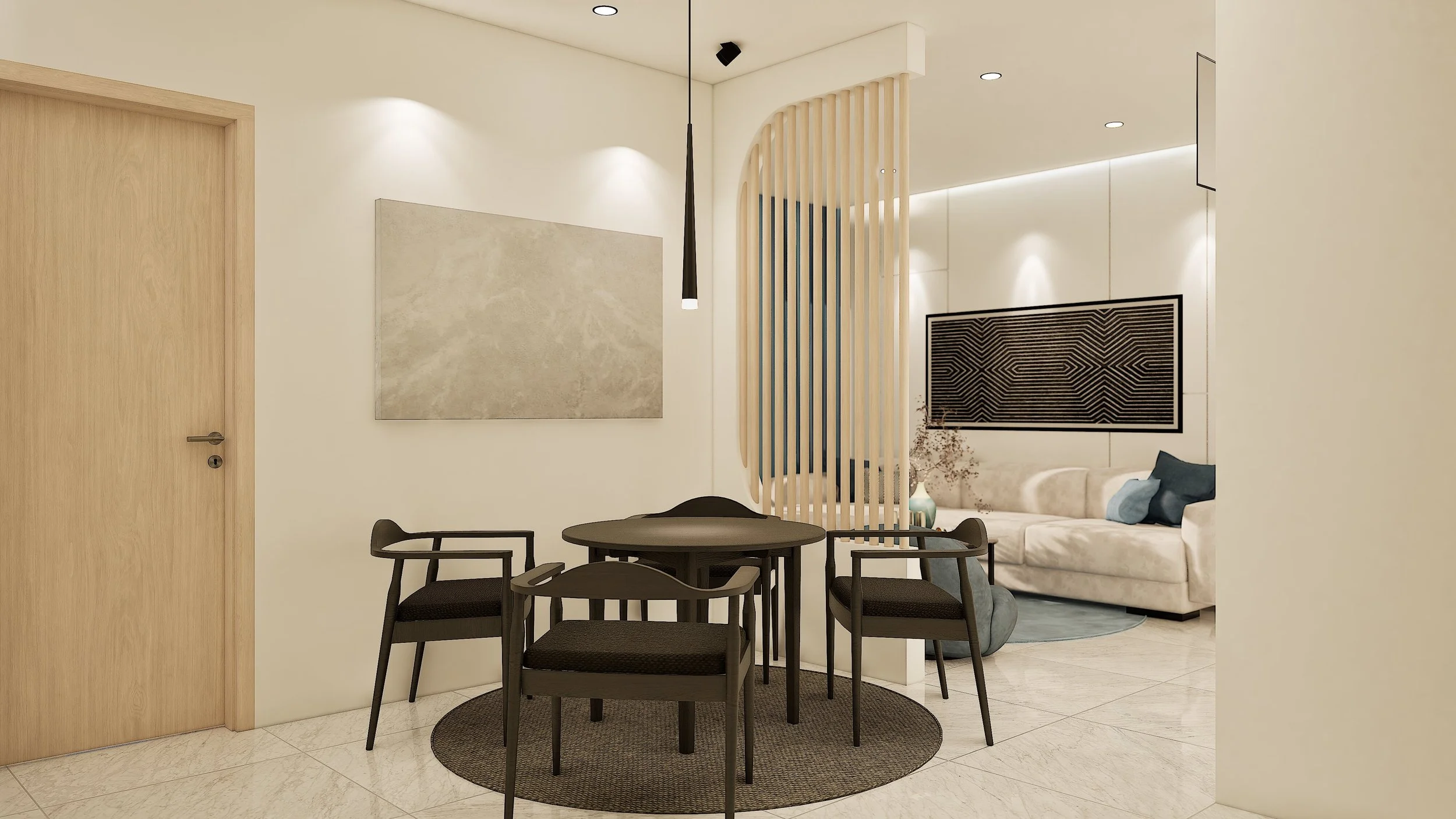 Dining Area: The refined ambiance extends into the dining area, featuring a sleek round table with modern black chairs. A sculptural pendant light adds a dynamic design element, while a wooden screen divider subtly delineates the space without compromising openness.