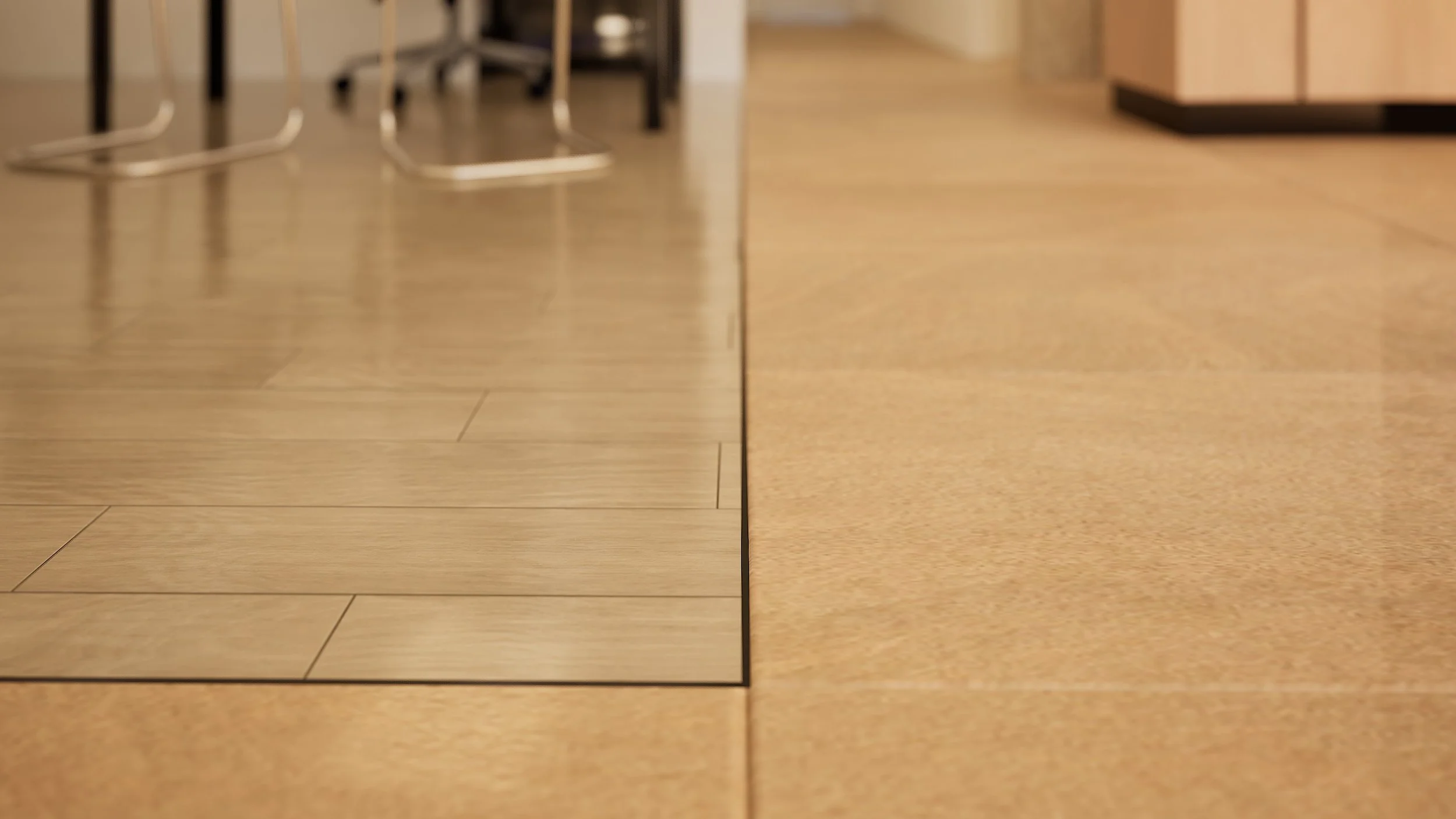 Dynamic Materiality: The interplay between travertine and wood flooring subtly zones the space, adding depth and layered aesthetics to the interior experience.