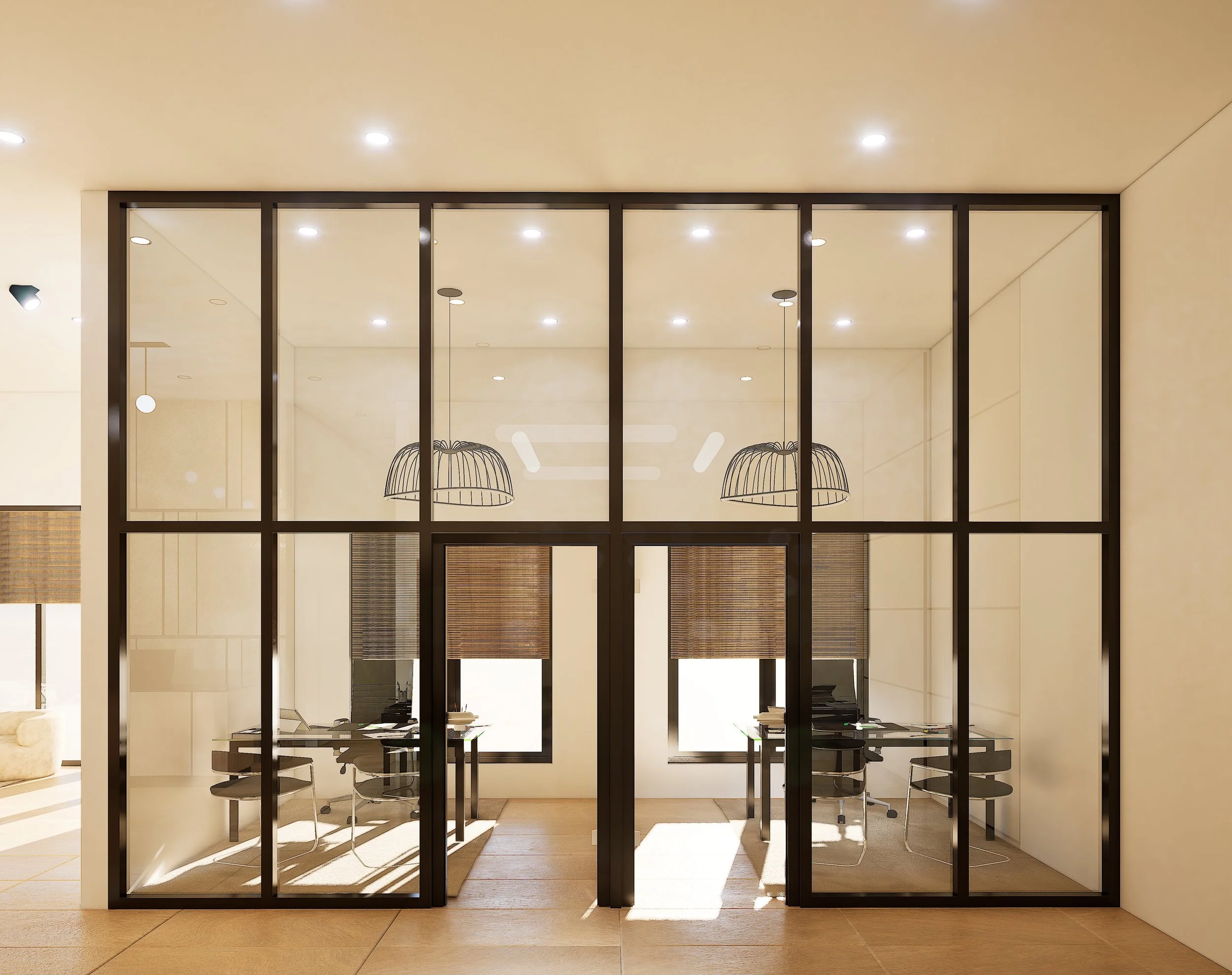 Meeting Spaces: Glass partitions offer visual openness, ensuring privacy while maintaining an airy and connected atmosphere.