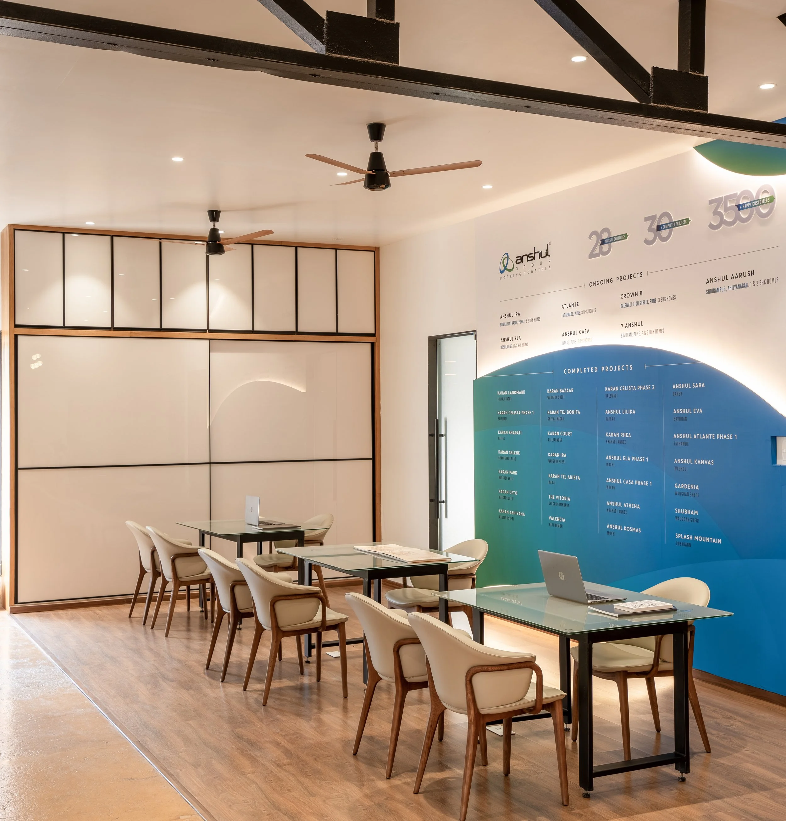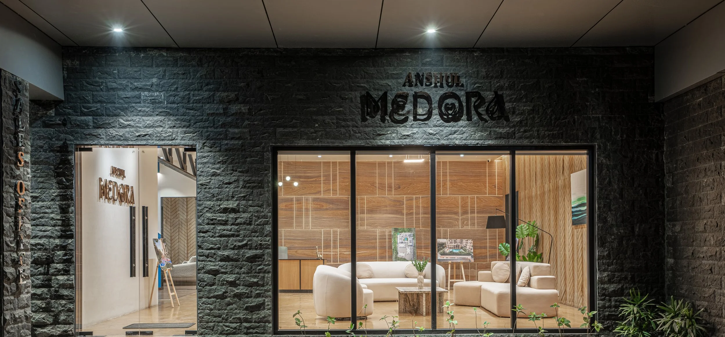 This sales office for upscale residential towers in Wagholi, Pune, is a refined blend of modern design and natural materials, crafted to create a sophisticated and inviting atmosphere. The palette, featuring powder-coated steel, sandstone, travertine, and wood, establishes a harmonious interplay of textures and tones that enhance the spatial experience.
